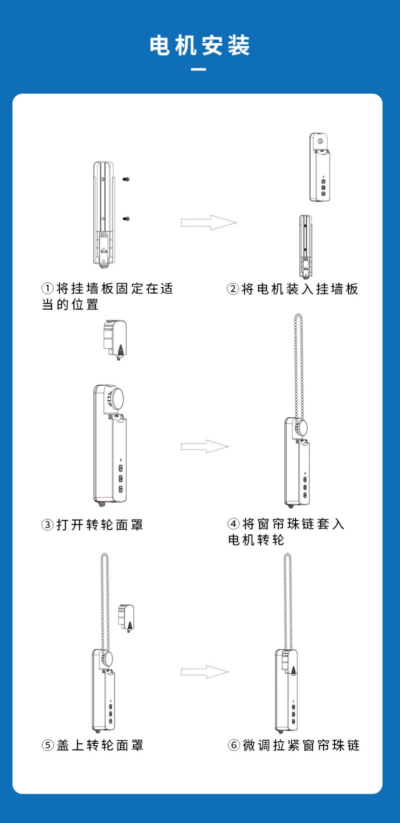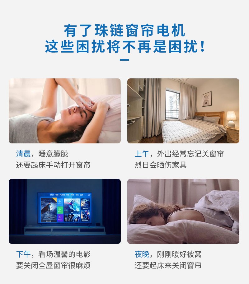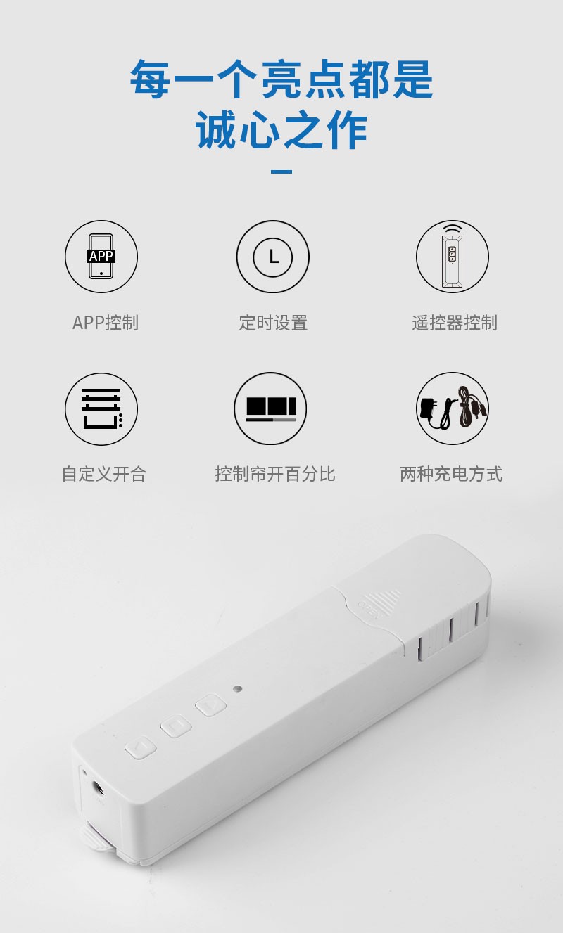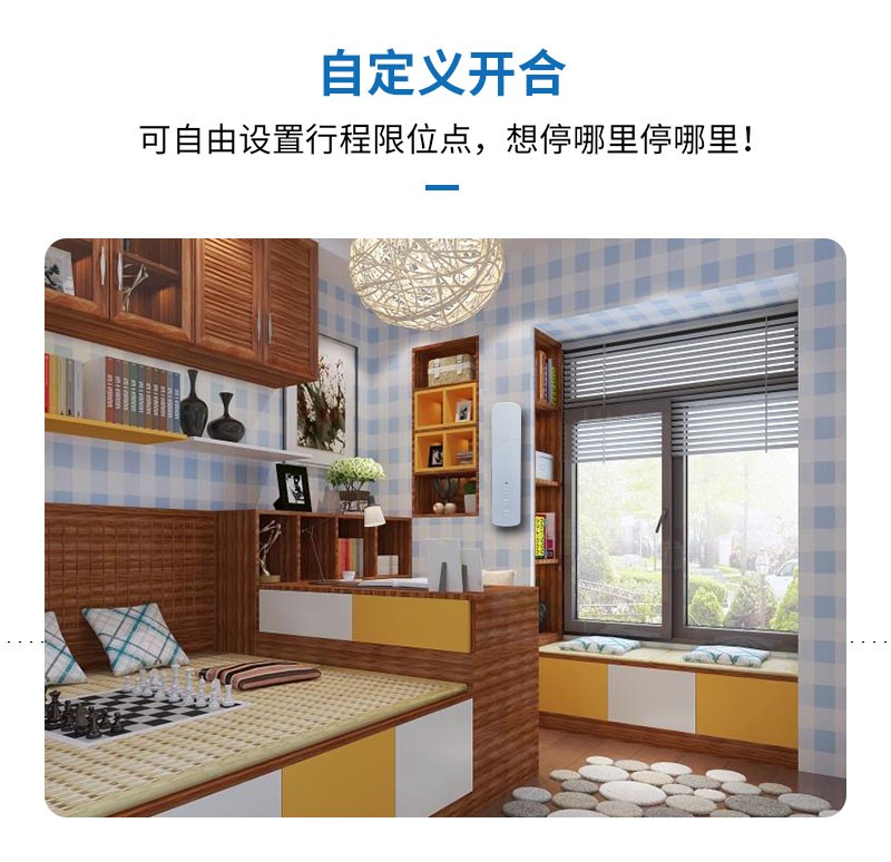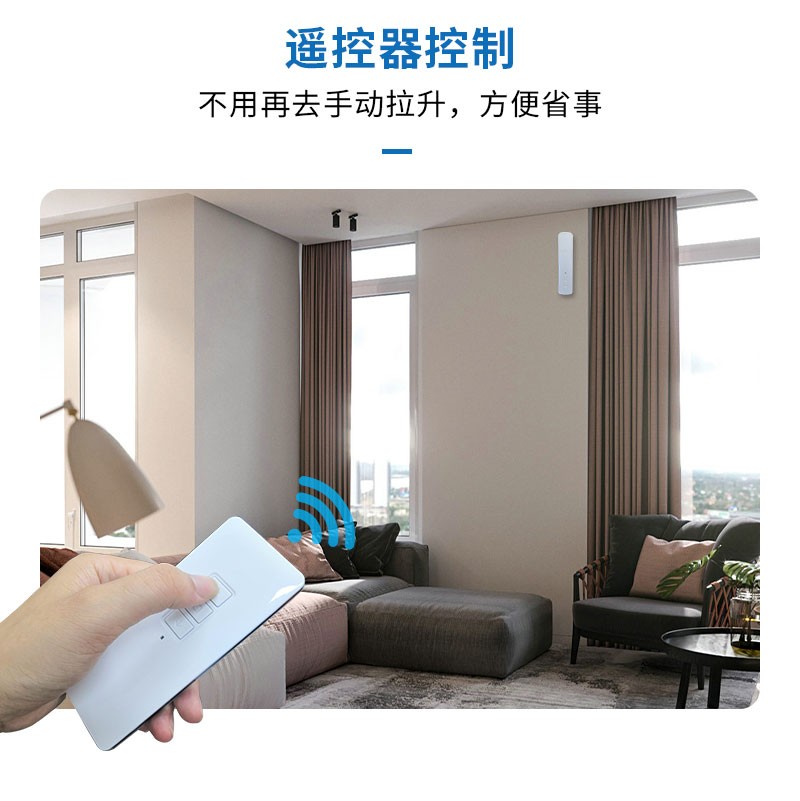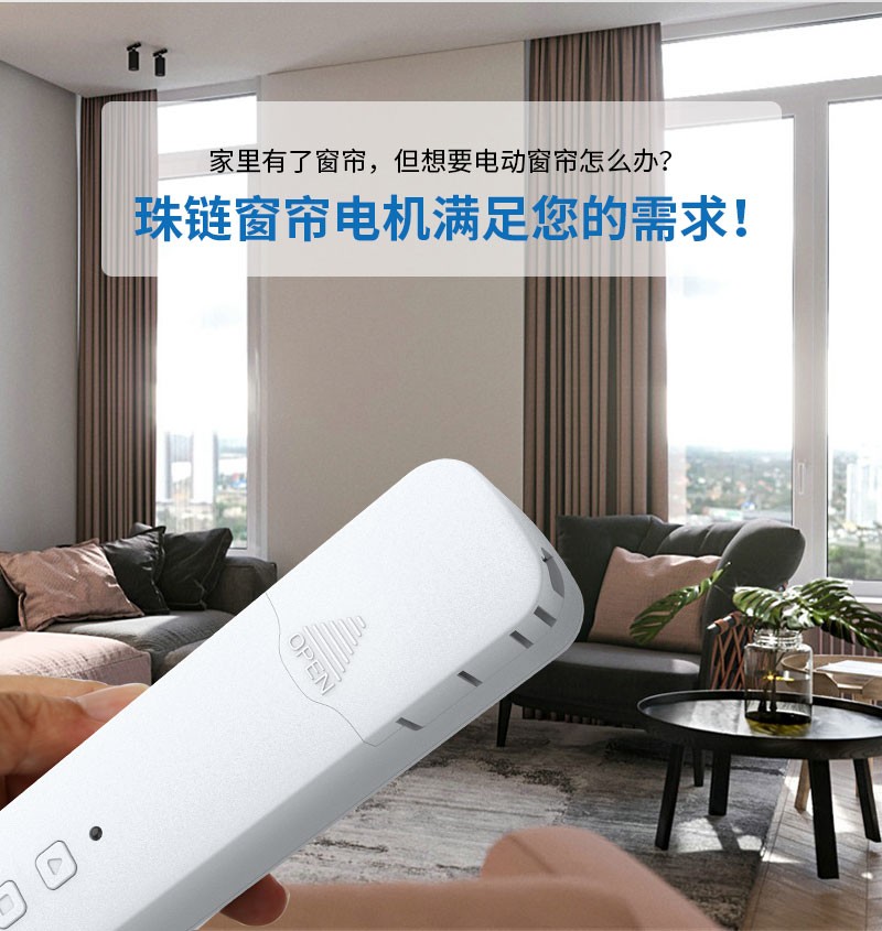 此產(chǎn)品適用于拉珠卷簾,可以把傳統(tǒng)的拉珠卷簾改變?yōu)橹悄茈妱哟昂?,安裝簡單,操作方便。安裝后可通過遙控器、語音、手機APP等控制窗簾升降。